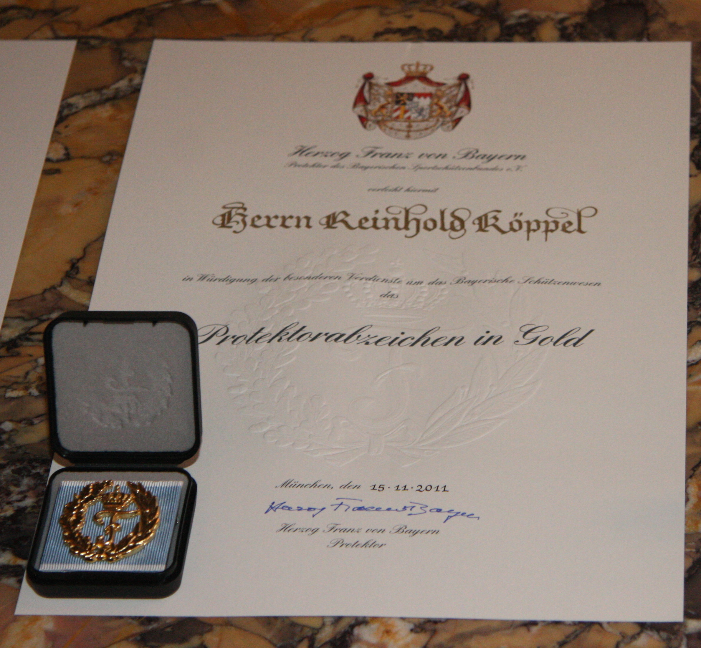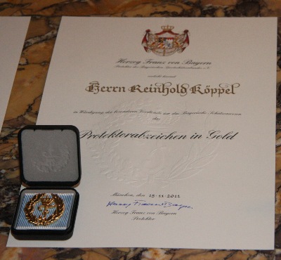 Am 15. November 2011 bekam der Gauschützenmeister des Schützengaues Main-Spessart Herr Reinhold Köppel aus den Händen seiner Königlichen Hoheit Herzog Franz von Bayern das Goldene Protektorabzeichen überreicht.